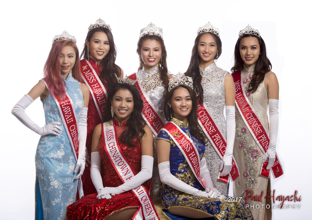 2018 Court – Princess Scarlet He, 1st Princess Mandy Ng, Miss Hawaii Chinese Annie Lin, Miss Chinatown Hawaii Penelope Ng Pack, Miss Chinese Jaycees Jocelyn Louie, Princess Ariel Orasud, Princess Alice Lin